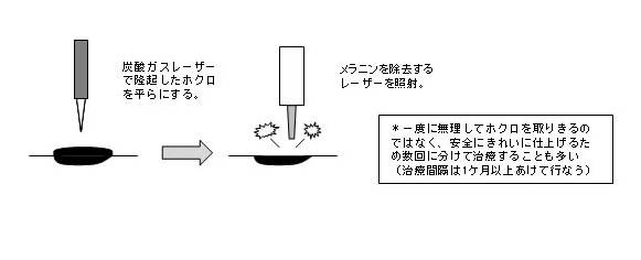 治療は隆起しているほくろに対してはまず炭酸ガスレーザーで平坦にし、その後色素に強いQ-スイッチヤグレーザーを用います。 2種類のレーザー機器を使い分けることによって、跡を残さず綺麗にほくろを治療していきます。