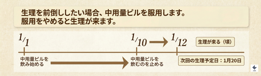 - 中用量ピルで早める場合: 10日以上連日服用 し、服用をやめると 2〜3日後 に生理開始